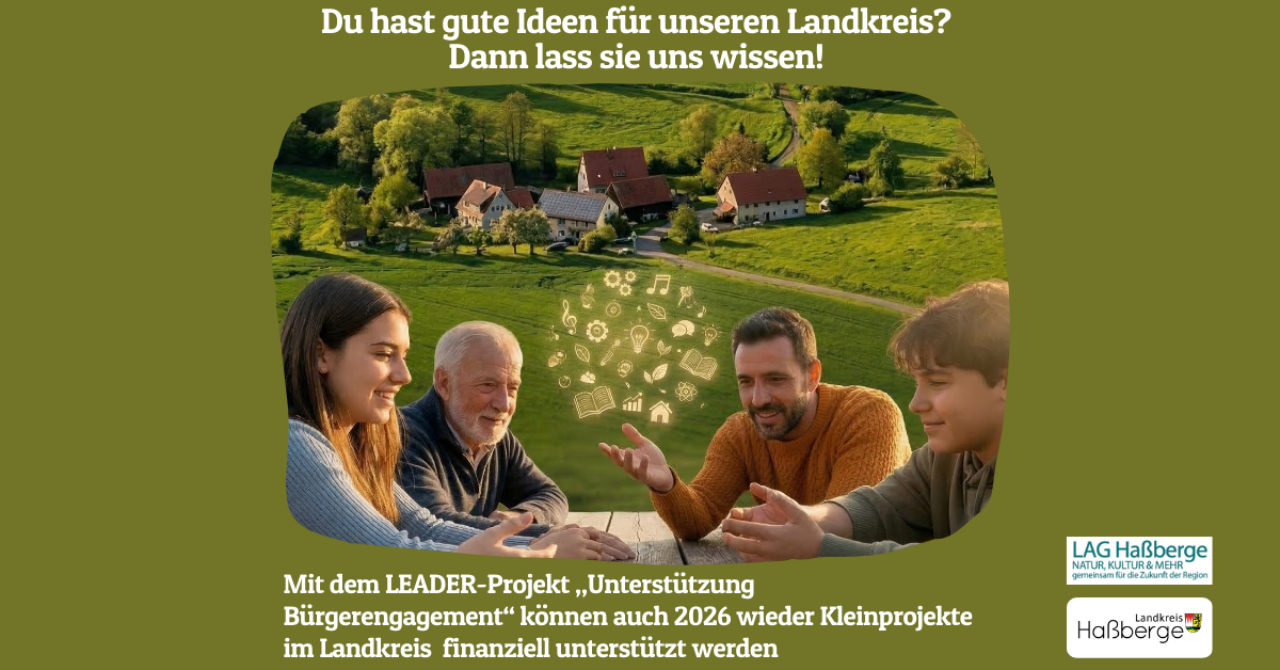 Du hast eine Projektidee, die unseren Landkreis noch lebenswerter macht? Die LAG Haßberge e.V. unterstützt Bürgerengagement auch 2026 mit insgesamt 20.000 €.